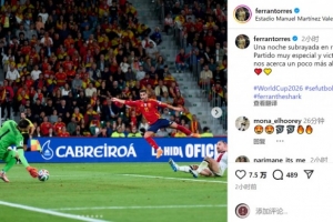 此役是费兰-托雷斯为西班牙队出战的第50场比赛,他在社交媒体上晒出比赛照片,配文:“值得铭记的夜晚,为西班牙出战50场,这是一场非常特别的比赛,胜利让我们距离世界杯更近一步。”