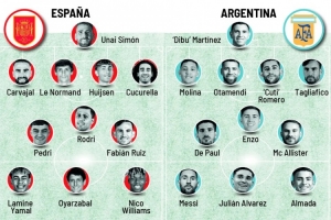 阿根廷:大马丁(8分);莫利纳(7分)、罗梅罗(8分)、奥塔门迪(8分)、塔利亚菲科(7分);恩佐(8分)、德保罗(7分)、麦卡利斯特(8分);阿尔马达(7分)、梅西(10分)、阿尔瓦雷斯(9分)