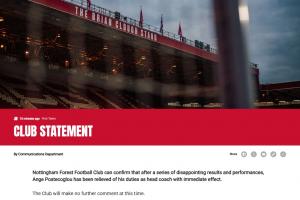 Nottingham Forest Football Club can confirm that after a series of disappointing results and performances, Ange Postecoglou has been relieved of his duties as head coach with immediate effect.