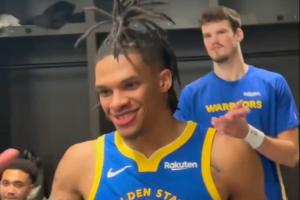 赛后,勇士更衣室内,理查德被奖励了今天的比赛用球。