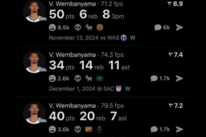 全场比赛,文班仅出场29分40秒,21投15中,三分2中1,罚球11中9,爆砍40分15篮板1助攻1抢断3盖帽,正负值+31。