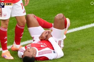 比赛第68分钟,加布里埃尔争顶时高高跃起后落地,下体重重撞上立柱。
