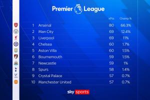 根据Opta目前的最新预测,如果阿森纳及其争冠对手继续这样踢下去,那么枪手只需70分即可夺冠。