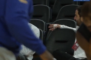 有人拍到库明加的经纪人与勇士总经理邓利维在场边聊天,而库明加在镜头近景训练。